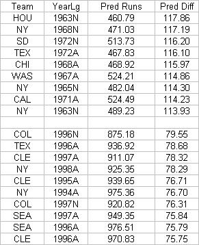 If Mantle got added to the 1963 Astros (Colt 45's), they would score 117.86 more runs. But he would only add 75.75 to the 1996 Indians. This difference is because Mantle would add 18 points to the Astros team OBP but only about 9 to the Indians. The Astros gained about .025 in ADJISO while the Indians gained just .015. Plus the Astros would gain more PAs.