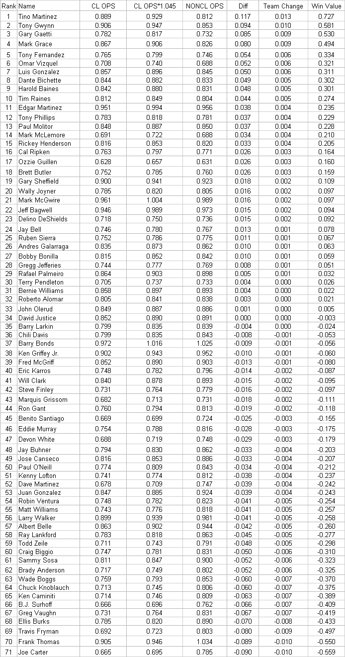 where CLOPS means how the team hit in CL situation and OPP refers to how their opponents did. NONCLOPS is how the team hit in non-CL situations. If a team's CL OPS goes up by .008, its winning percentage rises by .345*.008 or .00276. Over 162 games, the team wins .447 more games (.00276*162). I then found all the players from 1987-2001 who had 6,000 or more plate appearances and found out how much their OPS went up or down in CL situations as compared to non-CL situations. Then I estimated how much their team OPS went up and then calculated its impact on team wins over a season. There was one additional step. I raised each player's CL OPS by 4.5% because that is about the normal drop off in those situations (this might be due to not having the platoon advantage or just facing better than average pitchers when the game is on the line). If a player simply maintained his normal OPS in CL situations, he would essentially be a clutch hitter since OPS normally falls.