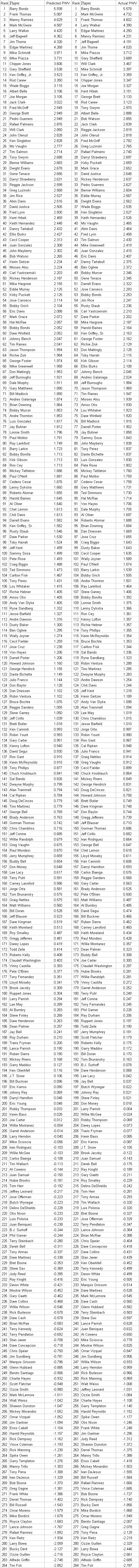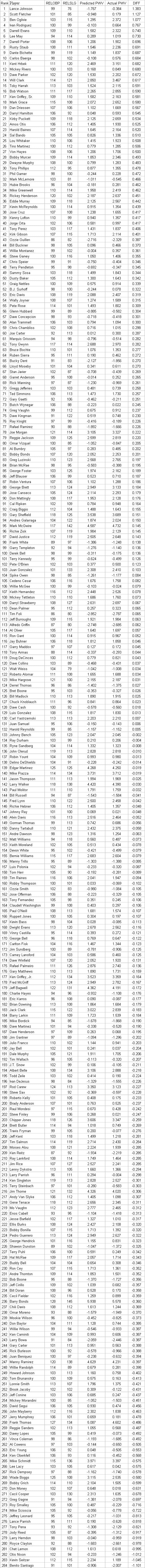 There is another table after this one that shows where all the players ranked in actual PWV and predicted PWV. Some players ranked higher in one than the other. If we did cross player comparisons, about 11% of the comparisons would be reversed if we used actual PWV as opposed to predicted PWV. That is, if we compared player A to every other player, in about 11% of the cases actual PWV would reverse who predicted PWV said was the better hitter. That does not seem like much change. In fact, the correlation between where a guy ranked in actual PWV and predicted PWV was about .96 (a perfect correlation is 1-that would happen if there were no change in ranks at all between actual PWV and predicted PWV). Also, about 80% of the players saw their rank change less than 28 places. That does not seem like much change either since 28 places is about 10% of the total number of players.