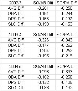 So, for example, the correlation between the change in a players strikeouts per AB and change in his batting average going from 2002-3 was -.261. If strikeouts went down, then AVG went up (only players who had 400+ PAs in each season were used). Most of these correlations were statistically significant. But how strong is the effect? And is it there just because strikeouts going down simply means that outs are going down?